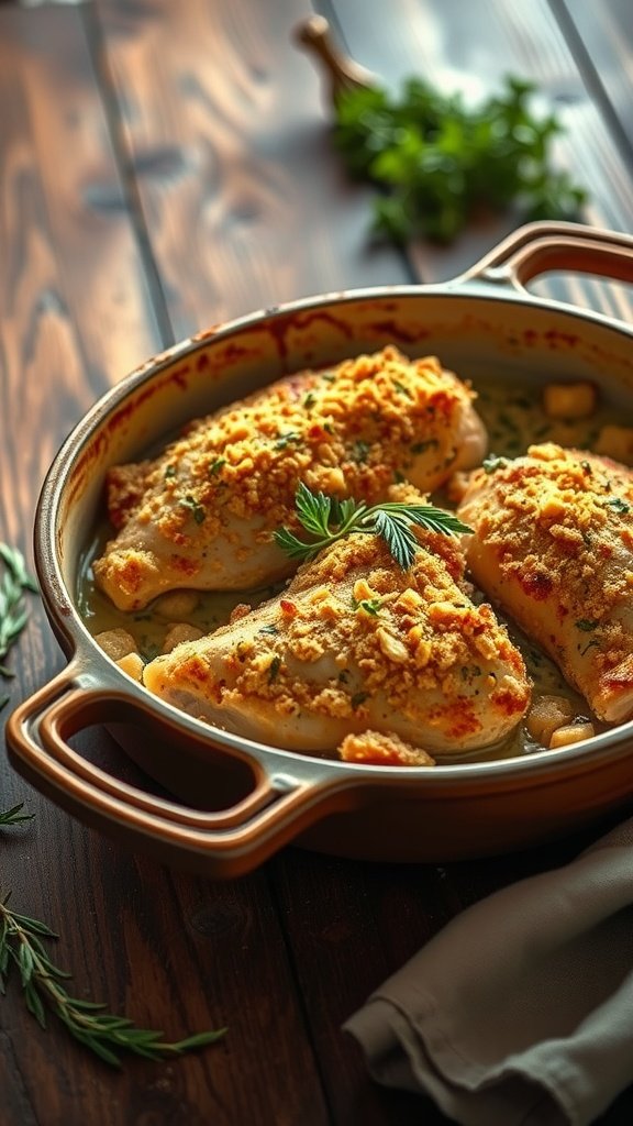 A delicious crispy chicken and potato bake in a rustic dish, garnished with herbs.